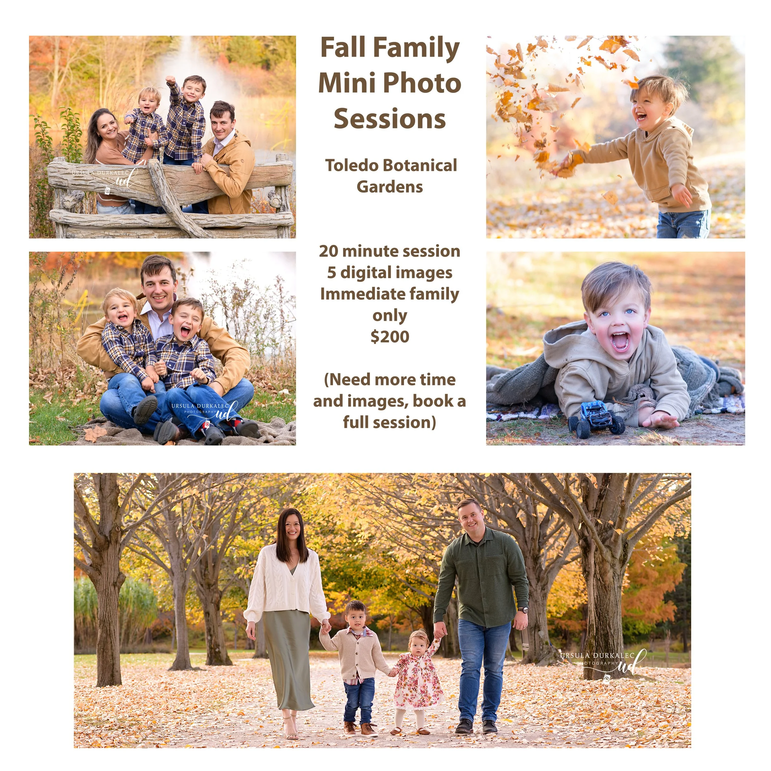 Two of my favorite places for beautiful fall colors and fall family sessions are Toledo Botanical Gardens and Oak Openings! Outdoor sessions are best done early mornings or about 90 minutes before sunset. Weekend and weekday sessions are available.